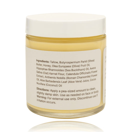 Tallow, Shea Butter, Honey, Olive Fruit Oil, Sea Buckthorn Oil, Oat Kernel Flour, Calendula Flower Extract, Roman Chamomile Flower Oil, Aloe Vera Juice, Coconut Oil. Ten ingredients. Nothing synthetic. Nothing unnecessary.